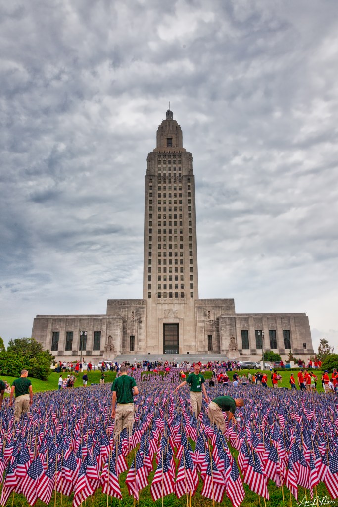 Grand Paradise Casino and Truck Stop at the foot of the Huey P. Long Bridge (known locally as the Old Bridge). The bridge can be seen in the background, with the casino truck stop on the Port Allen side of the river, right next to the levee.